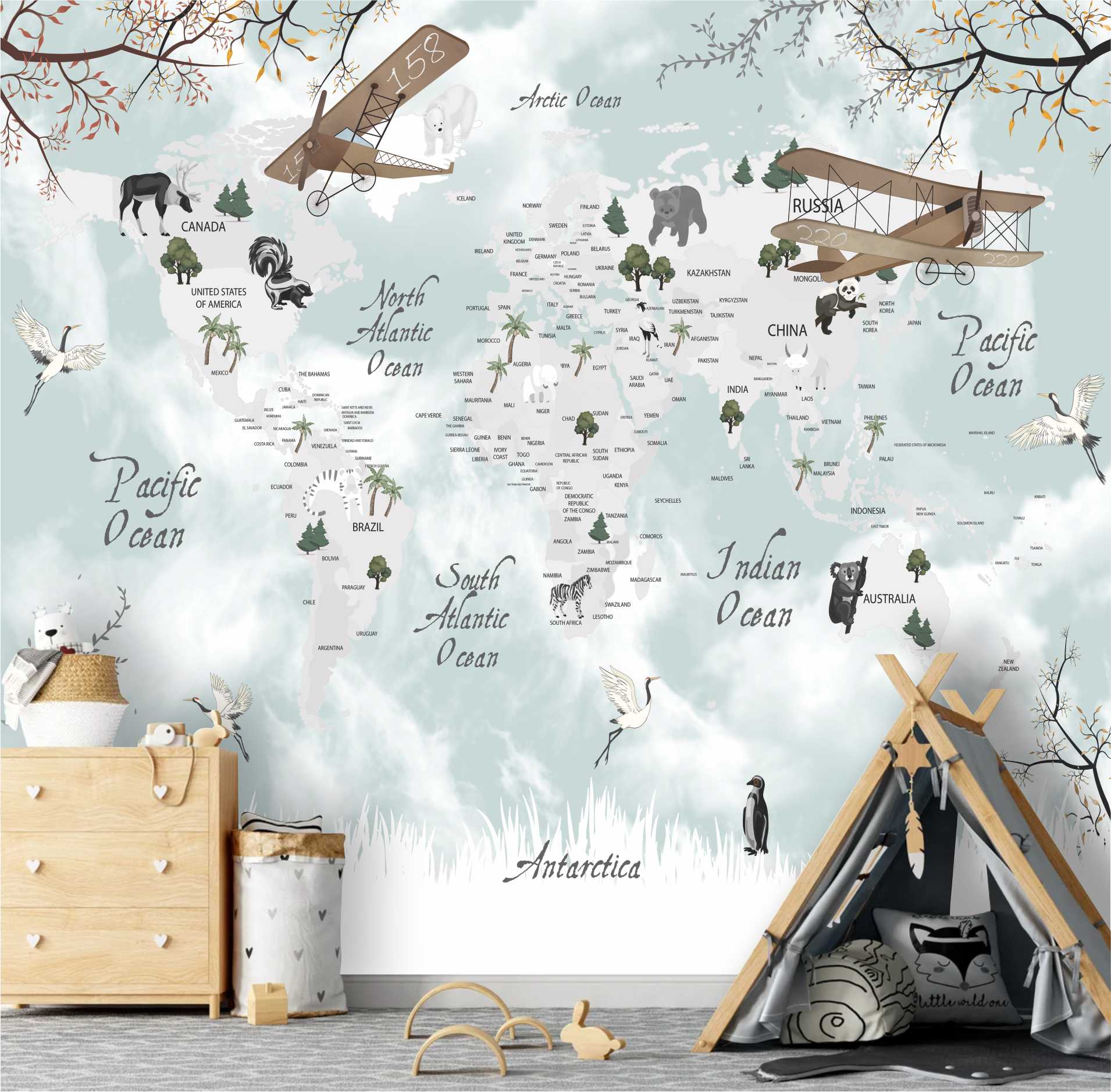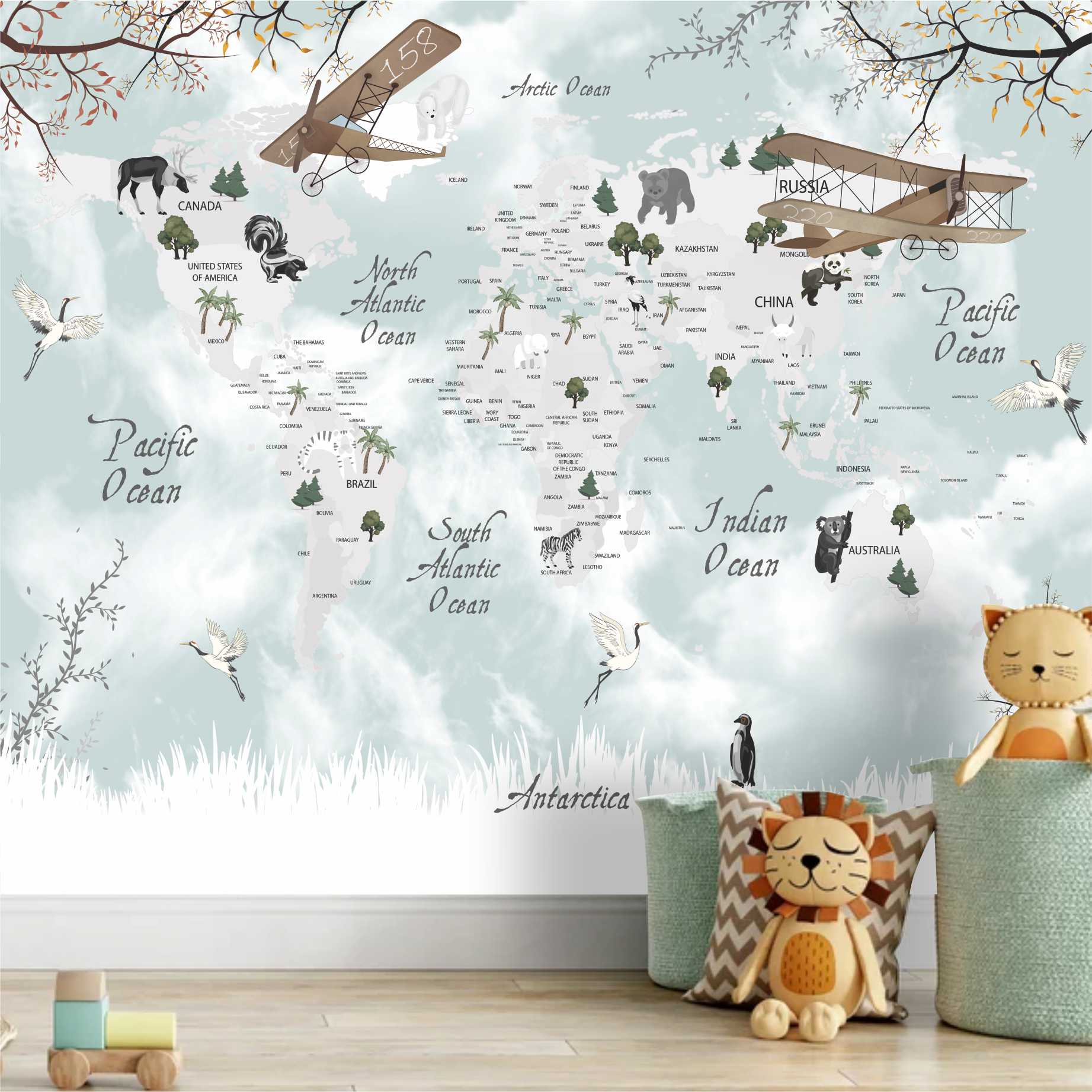 Adesivo Parede Mapa Infantil Zoo Aviões Balões Painel G1188